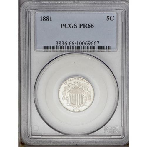 1881 5C PR66 PCGS. Barely perceptible speckles of ligh 1881[5C] PR66 PCGS.