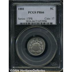 <B>1881<5C> PR66 PCGS.</B></I> Pristine surfaces, fully bright and completely untoned, this coin displays a fresh, vibrant appearance. Gems of this date are not overly scarce, but the quality of this specimen is a notch above what one normally sees. Population: 149 in 66, 21 finer (7/04). <BR><BR><B>Important notice:</B> Heritage usually auctions material at the rate of 200-250 lots per hour. On some occasions eBay Live bid software or the Internet may not be able to keep up with the pace of the auction. We recommend placing a realistic absentee bid now as insurance to avoid disappointment. Occasionally the auctioneer may eliminate or reject an eBay Live bid, and the auctioneer may also reopen a lot after the close of the eBay live bidding (usually because we missed an audience bid), and may reject your bid even if it shows you as the winning bidder. By bidding via eBay Live, you agree that Heritage may award the lot to another bidder at its sole discretion under the circumstances described above or any other reasonable circumstances. Since eBay bids are not shown to us until we open the lot on the floor, we treat those bids just like floor bids. In most cases the floor responds before the eBay bid is presented to us, due to Internet lag time, so for consistency we have made it a policy that floor bids are always considered first over tie eBay live bids. Also please note that all Heritage lots purchased through eBay Live carry a 20% Buyer's Premium. Please make sure you read the Terms and Conditions before you bid. </span></font></tr></table></td></tr></table>