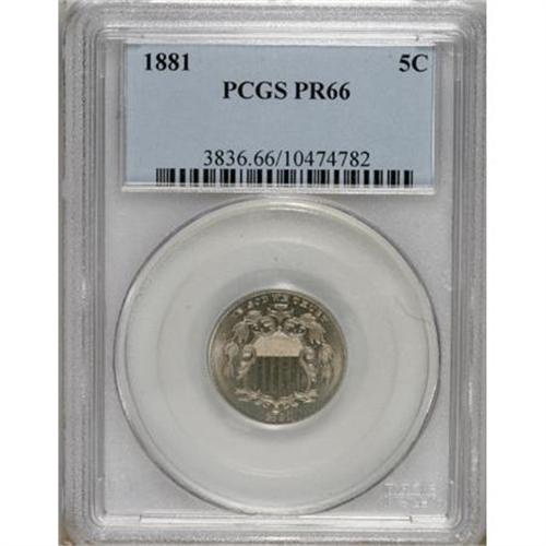 <B>1881 5C PR66 PCGS.</B></I> Ice-blue and peach tints visit this satiny and fully struck Premium Gem. Minor carbon along the right border denies an even finer grade. Collectors often select proofs to represent this low mintage date.<BR><BR><b>Shipping:</b> Coins & Currency (<a target="_blank" href="http://www.heritageauctions.com/common/shipping.php">view shipping information</a>)