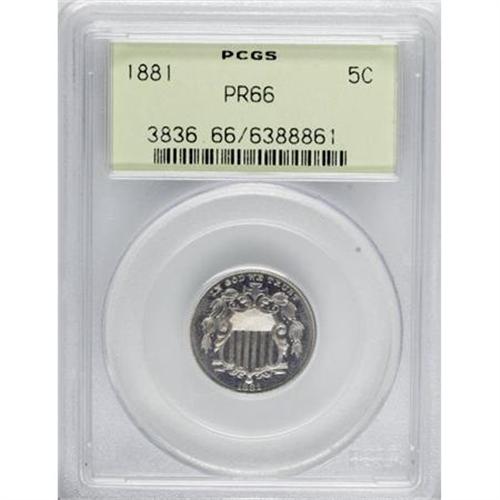 <B>1881 5C PR66 PCGS.</B></I> Speckles of gold color are evenly distributed over both sides of this Premium Gem, which illustrates cameo tendencies when the piece is rotated under a light source. The design elements are well brought up and uniformly struck throughout. There are no significant marks to report. Housed in a green-label holder.<BR><BR><b>Shipping:</b> Coins & Currency (<a target="_blank" href="http://www.heritageauctions.com/common/shipping.php">view shipping information</a>)