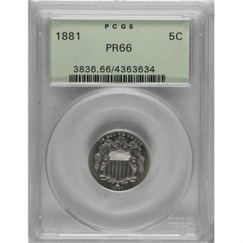 <B>1881 5C PR66 PCGS.</B></I> Sharply struck and free of any pesky planchet irregularities or contact marks, this essentially untoned specimen has an appealing overall appearance. An impressive Premium Gem proof, housed in a green label PCGS holder. <BR><I>From The Arnold & Harriet Collection, Part Two.</B></I><BR><BR><B>Coin Engraver:</B> James B. Longacre<BR><BR><b>Shipping:</b> Coins & Currency (<a target="_blank" href="http://www.heritageauctions.com/common/shipping.php">view shipping information</a>)