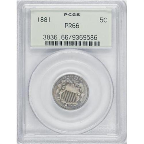 <B>1881 5C PR66 PCGS.</B></I> Crisply struck with attractive light gold, pearl-gray, and rose toning. The fields are typically non-reflective, with a strong, alluring cartwheel sheen across both sides. Well preserved and distraction-free. <BR><BR><B>Coin Engraver:</B> James B. Longacre<BR><BR><b>Shipping:</b> Coins & Currency (<a target="_blank" href="http://www.heritageauctions.com/common/shipping.php">view shipping information</a>)