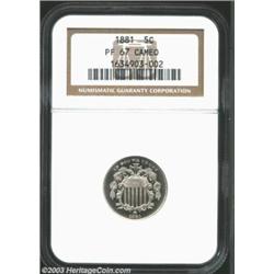 1881 5C PR67 Cameo NGC. A marvelous Superb Gem, one of the most appealing Shield Nickels we have exa
