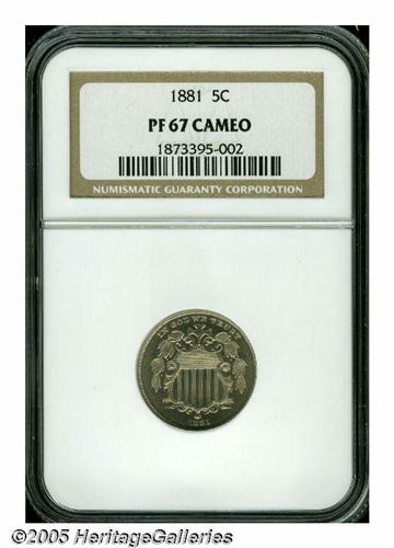 <B>1881<5C> PR67 Cameo NGC.</B></I> Brilliant and deeply mirrored with sparkling surfaces and pronounced white-on-black contrast on each side. Essentially flawless, this is a Superb type coin in every regard. Population: 17 in 67, 0 finer (4/05).