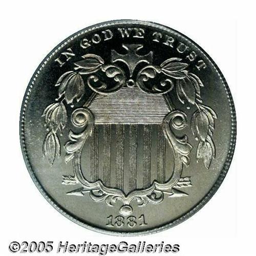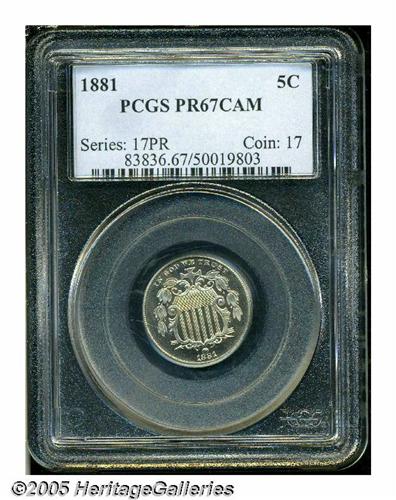 <B>1881<5C> PR67 Cameo PCGS.</B></I> Brilliant and deeply mirrored with sparkling surfaces and pronounced white-on-black contrast on each side. Essentially flawless, this is a Superb type coin in every regard. Population: 8 in 67 Cameo, 0 finer (4/05).<BR><I>From The Western Hills Collection.</B></I>