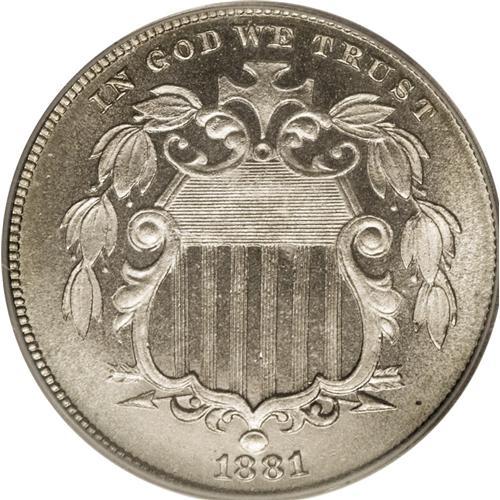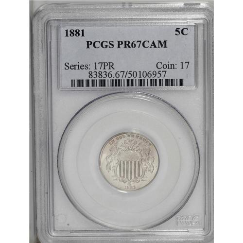 <B>1881<5C> PR67 Cameo PCGS.</B></I> Shield nickels from 1879 to 1881 are scarce or rare in high-quality business strike format, thus proofs are important pieces for a variety of collectors. This example is a lustrous light gray piece with hints of gold toning over reflective fields. Although the fields are not deeply mirrored, the devices are fully lustrous, providing desirable cameo contrast. Population: 9 in 67 Cameo, 0 finer (8/06).<BR><I>From The Troy Wiseman Collection.</B></I>