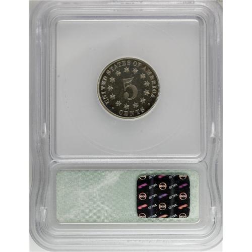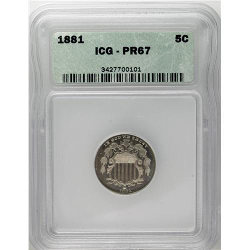 <B>1881 5C PR67 ICG.</B></I> Baby-blue peripheral patina and lemon-yellow at the centers enhances the eye appeal of this remarkable proof. Boldly impressed with modest contrast and only minuscule flaws.<BR><I>From The Hill Country Collection.</B></I><BR><BR><b>Shipping:</b> Coin/Currency (<a target="_blank" href="http://www.heritageauctions.com/common/shipping.php">view shipping information</a>)
