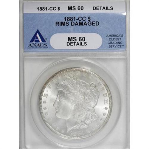 <B>1881-CC $1 --Rim Damaged--ANACS. MS60 Details.</B></I> NGC Census: (7/6528). PCGS Population (28/15299). Mintage: 296,000. Numismedia Wsl. Price for NGC/PCGS coin in MS60: $408. (#7126)<BR><BR><B>Coin Engraver:</B> George T. Morgan<BR><BR><b>Shipping:</b> Coins & Currency (<a target="_blank" href="http://www.heritageauctions.com/common/shipping.php">view shipping information</a>)