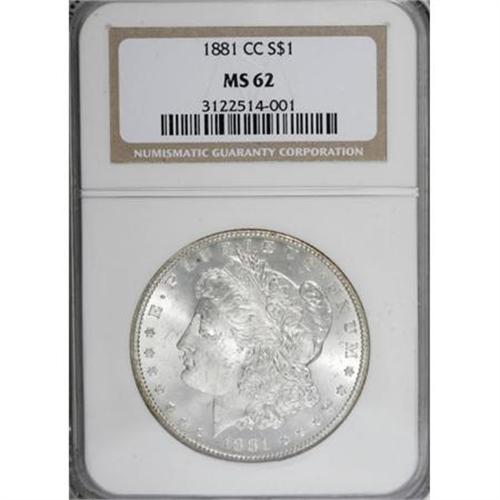 <B>1881-CC $1 MS62 NGC.</B></I> NGC Census: (376/6122). PCGS Population (881/14314). Mintage: 296,000. Numismedia Wsl. Price for NGC/PCGS coin in MS62: $433. (#7126)<BR><BR><B>Coin Engraver:</B> George T. Morgan<BR><BR><b>Shipping:</b> Coins & Currency (<a target="_blank" href="http://www.heritageauctions.com/common/shipping.php">view shipping information</a>)