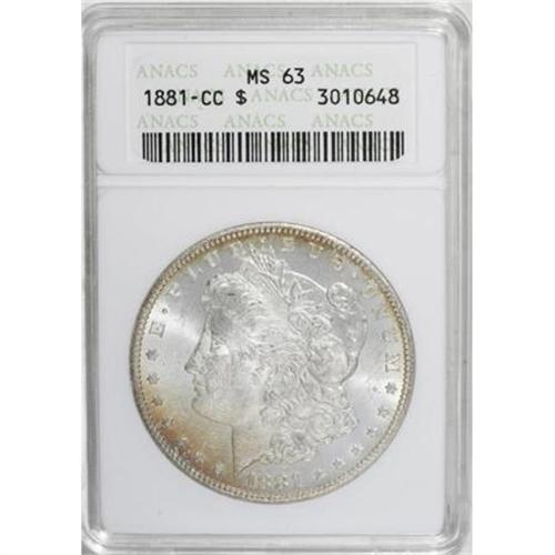 <B>1881-CC $1 MS63 ANACS.</B></I> . NGC Census: (1279/4932). PCGS Population (3222/11165). Mintage: 296,000. Numismedia Wsl. Price for NGC/PCGS coin in MS63: $455. (#7126)<BR><BR><B>Coin Engraver:</B> George T. Morgan<BR><BR><b>Shipping:</b> Coins & Currency (<a target="_blank" href="http://www.heritageauctions.com/common/shipping.php">view shipping information</a>)