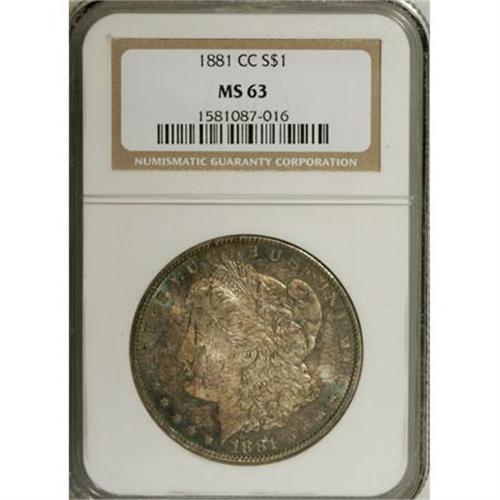 <B>1881-CC $1 MS63 NGC.</B></I> NGC Census: (1235/4800). PCGS Population (3182/10969). Mintage: 296,000. Numismedia Wsl. Price for NGC/PCGS coin in MS63: $450. (#7126)<BR><BR><B>Coin Engraver:</B> George T. Morgan<BR><BR><b>Shipping:</b> Coins & Currency (<a target="_blank" href="http://www.heritageauctions.com/common/shipping.php">view shipping information</a>)