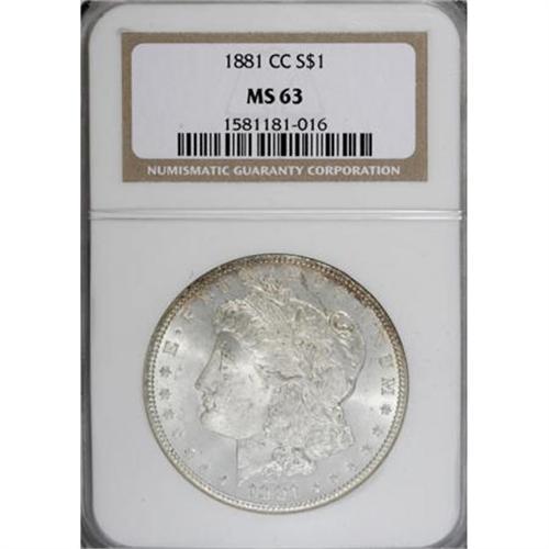 <B>1881-CC $1 MS63 NGC.</B></I> NGC Census: (1235/4800). PCGS Population (3192/11056). Mintage: 296,000. Numismedia Wsl. Price for NGC/PCGS coin in MS63: $450. (#7126)<BR><BR><B>Coin Engraver:</B> George T. Morgan<BR><BR><b>Shipping:</b> Coins & Currency (<a target="_blank" href="http://www.heritageauctions.com/common/shipping.php">view shipping information</a>)