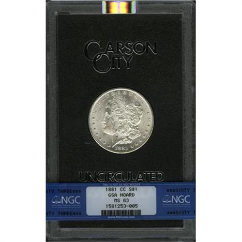 <B>1881-CC $1 MS63 NGC.</B></I> The Box and Certificate of Issue are included. NGC Census: (1257/4847). PCGS Population (3202/11091). Mintage: 296,000. Numismedia Wsl. Price for NGC/PCGS coin in MS63: $450. (#7126)<BR><BR><B>Coin Engraver:</B> George T. Morgan<BR><BR><b>Shipping:</b> Coins & Currency (<a target="_blank" href="http://www.heritageauctions.com/common/shipping.php">view shipping information</a>)