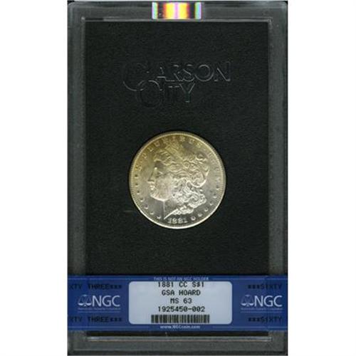 <B>1881-CC $1 MS63 NGC.</B></I> NGC Census: (1263/4894). PCGS Population (3212/11128). Mintage: 296,000. Numismedia Wsl. Price for NGC/PCGS coin in MS63: $450. (#7126)<BR><BR><B>Coin Engraver:</B> George T. Morgan<BR><BR><b>Shipping:</b> Coins & Currency (<a target="_blank" href="http://www.heritageauctions.com/common/shipping.php">view shipping information</a>)