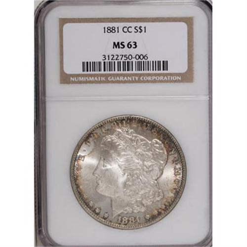 <B>1881-CC $1 MS63 NGC.</B></I> NGC Census: (1284/4953). PCGS Population (3227/11211). Mintage: 296,000. Numismedia Wsl. Price for NGC/PCGS coin in MS63: $455. (#7126)<BR><BR><B>Coin Engraver:</B> George T. Morgan<BR><BR><b>Shipping:</b> Coins & Currency (<a target="_blank" href="http://www.heritageauctions.com/common/shipping.php">view shipping information</a>)