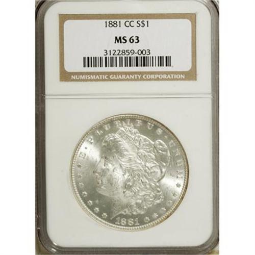 <B>1881-CC $1 MS63 NGC.</B></I> NGC Census: (1295/4979). PCGS Population (3234/11236). Mintage: 296,000. Numismedia Wsl. Price for NGC/PCGS coin in MS63: $455. (#7126)<BR><BR><B>Coin Engraver:</B> George T. Morgan<BR><BR><b>Shipping:</b> Coins & Currency (<a target="_blank" href="http://www.heritageauctions.com/common/shipping.php">view shipping information</a>)