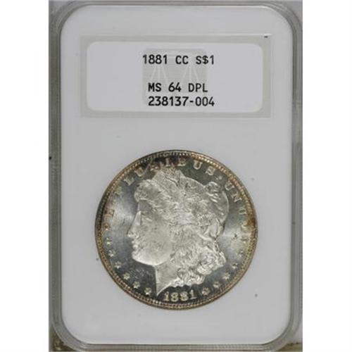 <B>1881-CC $1 MS64 Deep Mirror Prooflike NGC.</B></I> VAM-2. The 8s in the date have die fill suggestive of repunching. This flashy near-Gem is crisply struck and has attractive orange, fire-red, and navy-blue peripheral toning. Housed in a prior generation holder.<BR><BR><b>Shipping:</b> Coins & Currency (<a target="_blank" href="http://www.heritageauctions.com/common/shipping.php">view shipping information</a>)