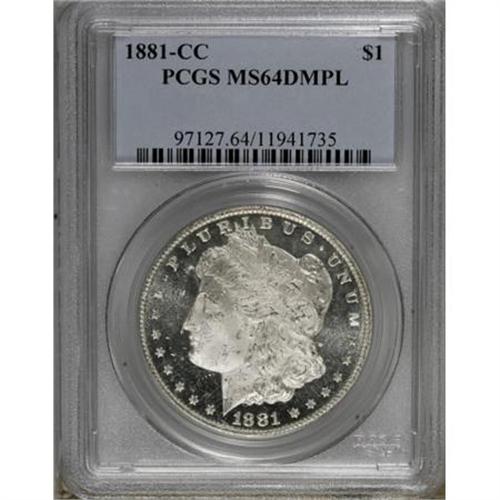 <B>1881-CC $1 MS64 Deep Mirror Prooflike PCGS.</B></I> An amazing level of contrast is the calling card of this magnificent Deep Mirror Prooflike near-Gem. The sharply struck devices show ample frost, and the fields of each side offer reflectivity at arm's length. A few light luster grazes and sequence of reed marks below the chin preclude a finer designation.<BR><BR><b>Shipping:</b> Coins & Currency (<a target="_blank" href="http://www.heritageauctions.com/common/shipping.php">view shipping information</a>)