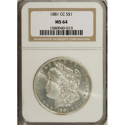<B>1881-CC $1 MS64 NGC.</B></I> NGC Census: (2468/2307). PCGS Population (5754/5143). Mintage: 296,000. Numismedia Wsl. Price for NGC/PCGS coin in MS64: $480. (#7126)<BR><BR><B>Coin Engraver:</B> George T. Morgan<BR><BR><b>Shipping:</b> Coins & Currency (<a target="_blank" href="http://www.heritageauctions.com/common/shipping.php">view shipping information</a>\)