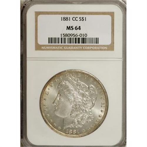 <B>1881-CC $1 MS64 NGC.</B></I> NGC Census: (2475/2310). PCGS Population (5761/5153). Mintage: 296,000. Numismedia Wsl. Price for NGC/PCGS coin in MS64: $480. (#7126)<BR><BR><B>Coin Engraver:</B> George T. Morgan<BR><BR><b>Shipping:</b> Coins & Currency (<a target="_blank" href="http://www.heritageauctions.com/common/shipping.php">view shipping information</a>)