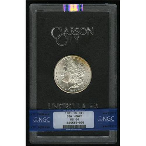 <B>1881-CC $1 MS64 NGC.</B></I> NGC Census: (2485/2315). PCGS Population (5782/5178). Mintage: 296,000. Numismedia Wsl. Price for NGC/PCGS coin in MS64: $480. (#7126)<BR><BR><B>Coin Engraver:</B> George T. Morgan<BR><BR><b>Shipping:</b> Coins & Currency (<a target="_blank" href="http://www.heritageauctions.com/common/shipping.php">view shipping information</a>)