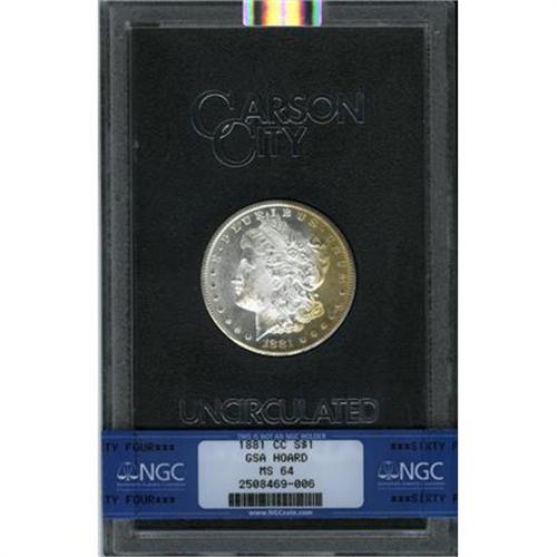 <B>1881-CC $1 MS64 NGC.</B></I> NGC Census: (2485/2315). PCGS Population (5788/5181). Mintage: 296,000. Numismedia Wsl. Price for NGC/PCGS coin in MS64: $480. (#7126)<BR><BR><B>Coin Engraver:</B> George T. Morgan<BR><BR><b>Shipping:</b> Coins & Currency (<a target="_blank" href="http://www.heritageauctions.com/common/shipping.php">view shipping information</a>)