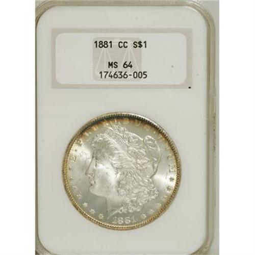 <B>1881-CC $1 MS64 NGC.</B></I> NGC Census: (2485/2315). PCGS Population (5798/5197). Mintage: 296,000. Numismedia Wsl. Price for NGC/PCGS coin in MS64: $480. (#7126)<BR><BR><B>Coin Engraver:</B> George T. Morgan<BR><BR><b>Shipping:</b> Coins & Currency (<a target="_blank" href="http://www.heritageauctions.com/common/shipping.php">view shipping information</a>)