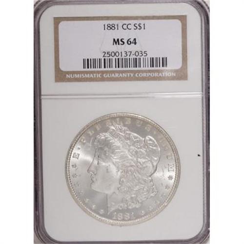 <B>1881-CC $1 MS64 NGC.</B></I> NGC Census: (2573/2416). PCGS Population (5889/5347). Mintage: 296,000. Numismedia Wsl. Price for NGC/PCGS coin in MS64: $480. (#7126)<BR><BR><B>Coin Engraver:</B> George T. Morgan<BR><BR><b>Shipping:</b> Coins & Currency (<a target="_blank" href="http://www.heritageauctions.com/common/shipping.php">view shipping information</a>)