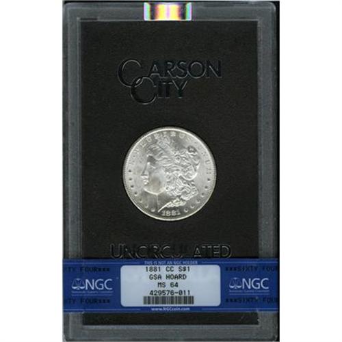 <B>1881-CC $1 MS64 NGC.</B></I> NGC Census: (2564/2389). PCGS Population (5882/5329). Mintage: 296,000. Numismedia Wsl. Price for NGC/PCGS coin in MS64: $480. (#7126)<BR><BR><B>Coin Engraver:</B> George T. Morgan<BR><BR><b>Shipping:</b> Coins & Currency (<a target="_blank" href="http://www.heritageauctions.com/common/shipping.php">view shipping information</a>)