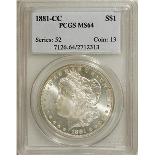 <B>1881-CC $1 MS64 PCGS.</B></I> PCGS Population (5754/5143). NGC Census: (2468/2307). Mintage: 296,000. Numismedia Wsl. Price for NGC/PCGS coin in MS64: $480. (#7126)<BR><BR><B>Coin Engraver:</B> George T. Morgan<BR><BR><b>Shipping:</b> Coins & Currency (<a target="_blank" href="http://www.heritageauctions.com/common/shipping.php">view shipping information</a>\)
