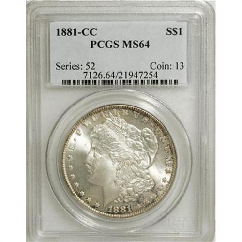 <B>1881-CC $1 MS64 PCGS.</B></I> PCGS Population (5695/5119). NGC Census: (2467/2287). Mintage: 296,000. Numismedia Wsl. Price for NGC/PCGS coin in MS64: $480. (#7126)<BR><BR><B>Coin Engraver:</B> George T. Morgan<BR><BR><b>Shipping:</b> Coins & Currency (<a target="_blank" href="http://www.heritageauctions.com/common/shipping.php">view shipping information</a>)