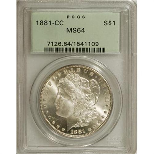 <B>1881-CC $1 MS64 PCGS.</B></I> PCGS Population (5767/5158). NGC Census: (2475/2310). Mintage: 296,000. Numismedia Wsl. Price for NGC/PCGS coin in MS64: $480. (#7126)<BR><BR><B>Coin Engraver:</B> George T. Morgan<BR><BR><b>Shipping:</b> Coins & Currency (<a target="_blank" href="http://www.heritageauctions.com/common/shipping.php">view shipping information</a>)