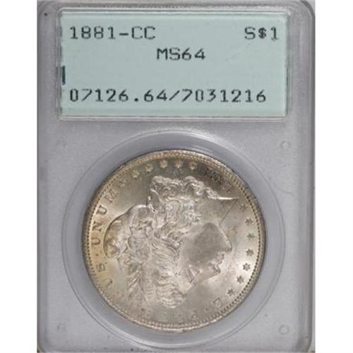 <B>1881-CC $1 MS64 PCGS.</B></I> PCGS Population (5798/5197). NGC Census: (2485/2315). Mintage: 296,000. Numismedia Wsl. Price for NGC/PCGS coin in MS64: $480. (#7126)<BR><BR><B>Coin Engraver:</B> George T. Morgan<BR><BR><b>Shipping:</b> Coins & Currency (<a target="_blank" href="http://www.heritageauctions.com/common/shipping.php">view shipping information</a>)