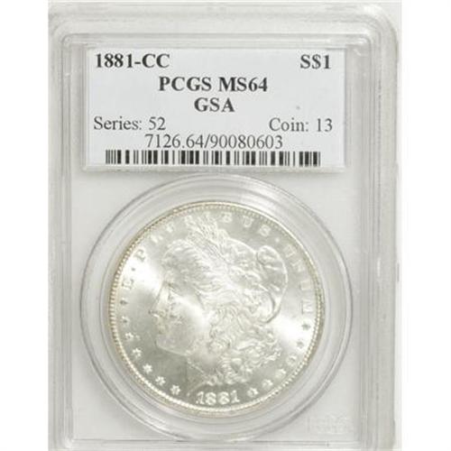 <B>1881-CC $1 MS64 PCGS.</B></I> Ex: GSA. PCGS Population (5812/5229). NGC Census: (2485/2315). Mintage: 296,000. Numismedia Wsl. Price for NGC/PCGS coin in MS64: $480. (#7126)<BR><BR><B>Coin Engraver:</B> George T. Morgan<BR><BR><b>Shipping:</b> Coins & Currency (<a target="_blank" href="http://www.heritageauctions.com/common/shipping.php">view shipping information</a>)