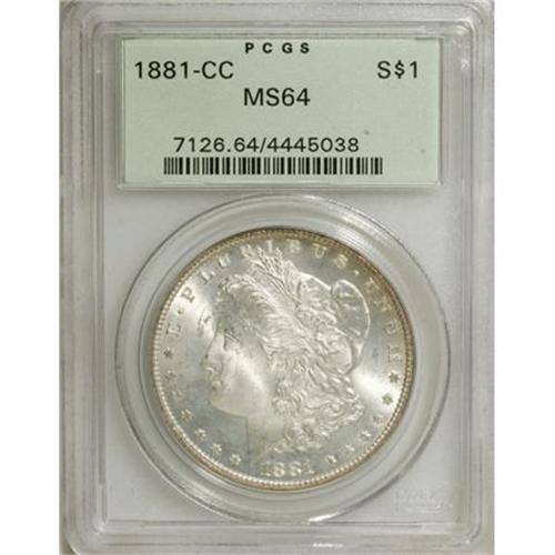 <B>1881-CC $1 MS64 PCGS.</B></I> . PCGS Population (5876/5323). NGC Census: (2554/2392). Mintage: 296,000. Numismedia Wsl. Price for NGC/PCGS coin in MS64: $480. (#7126)<BR><BR><B>Coin Engraver:</B> George T. Morgan<BR><BR><b>Shipping:</b> Coins & Currency (<a target="_blank" href="http://www.heritageauctions.com/common/shipping.php">view shipping information</a>)