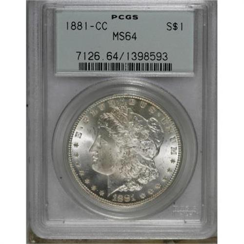 <B>1881-CC $1 MS64 PCGS.</B></I> PCGS Population (5882/5329). NGC Census: (2564/2389). Mintage: 296,000. Numismedia Wsl. Price for NGC/PCGS coin in MS64: $480. (#7126)<BR><BR><B>Coin Engraver:</B> George T. Morgan<BR><BR><b>Shipping:</b> Coins & Currency (<a target="_blank" href="http://www.heritageauctions.com/common/shipping.php">view shipping information</a>)