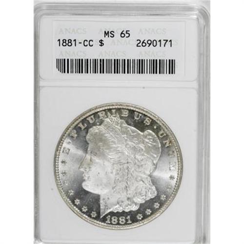 <B>1881-CC $1 MS65 ANACS.</B></I> NGC Census: (1626/689). PCGS Population (3724/1454). Mintage: 296,000. Numismedia Wsl. Price for NGC/PCGS coin in MS65: $740. (#7126)<BR><BR><B>Coin Engraver:</B> George T. Morgan<BR><BR><b>Shipping:</b> Coins & Currency (<a target="_blank" href="http://www.heritageauctions.com/common/shipping.php">view shipping information</a>)