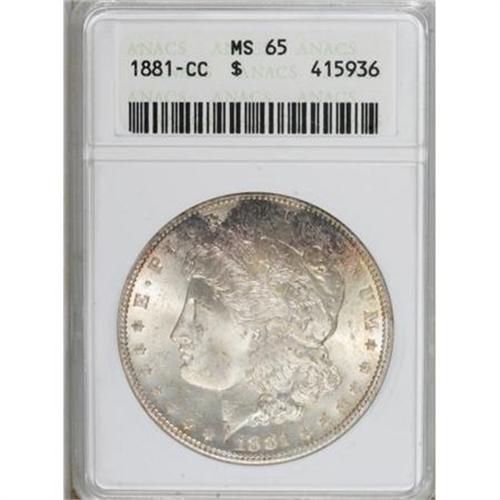 <B>1881-CC $1 MS65 ANACS.</B></I> This low-mintage issue is readily available today due to the dispersal of former Treasury holdings. Occasional splashes of mauve and bluish-gray patina grace highly lustrous surfaces of this attractive Gem. A few minute contact marks are totally consistent with the grade.<BR><BR><B>Coin Engraver:</B> George T. Morgan<BR><BR><b>Shipping:</b> Coins & Currency (<a target="_blank" href="http://www.heritageauctions.com/common/shipping.php">view shipping information</a>)