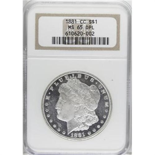 <B>1881-CC $1 MS65 Deep Mirror Prooflike NGC.</B></I> A white-on-black Gem with exceptional eye appeal. The devices are crisply struck and thickly frosted, and the fields are magnificently mirrored. Well preserved and close to brilliant with the exquisite cameo effect collectors prize for this date and mint. The '81-CC has the second lowest Carson City Morgan mintage. Census: 57 in 65 DMPL, 10 finer (6/07).<BR><I>From the Diamond Head Collection.</B></I><BR><BR><b>Shipping:</b> Coins & Currency (<a target="_blank" href="http://www.heritageauctions.com/common/shipping.php">view shipping information</a>)