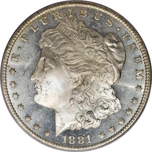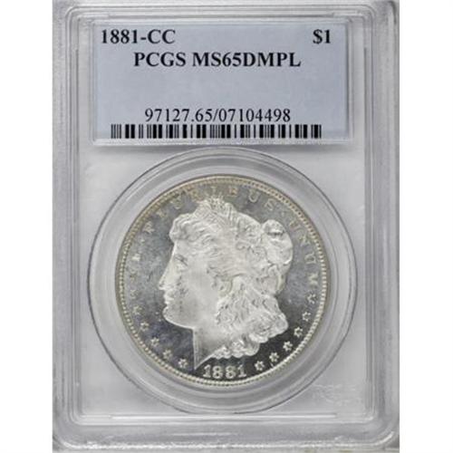 <B>1881-CC $1 MS65 Deep Mirror Prooflike PCGS.</B></I> The issue's mintage of 296,000 coins--second-lowest among the CC dates--and its plentiful survival in Treasury holdings result in the appearance of the occasional delightful Gem Deep Mirror Prooflike coin, such as the present piece. This specimen offers brilliant, untoned, and extremely reflective surfaces with thick, icy mint frost on the devices. The sharp strike is another plus. <BR><BR><b>Shipping:</b> Coins & Currency (<a target="_blank" href="http://www.heritageauctions.com/common/shipping.php">view shipping information</a>)