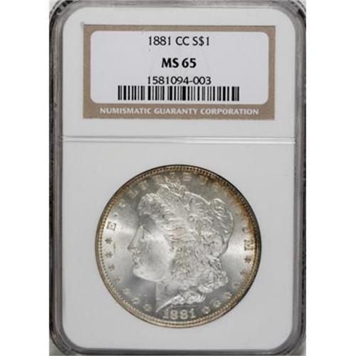 <B>1881-CC $1 MS65 NGC.</B></I> Remarkable quality with light silver luster and peripheral gold toning. Both sides are fully detailed, including excellent hair details over Liberty's ear.<BR><BR><B>Coin Engraver:</B> George T. Morgan<BR><BR><b>Shipping:</b> Coins & Currency (<a target="_blank" href="http://www.heritageauctions.com/common/shipping.php">view shipping information</a>)