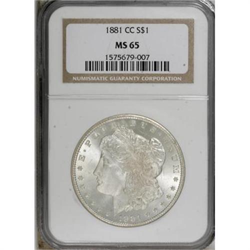 <B>1881-CC $1 MS65 NGC.</B></I> NGC Census: (1623/687). PCGS Population (3708/1445). Mintage: 296,000. Numismedia Wsl. Price for NGC/PCGS coin in MS65: $740. (#7126)<BR><BR><B>Coin Engraver:</B> George T. Morgan<BR><BR><b>Shipping:</b> Coins & Currency (<a target="_blank" href="http://www.heritageauctions.com/common/shipping.php">view shipping information</a>)