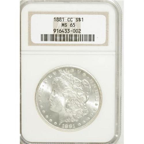 <B>1881-CC $1 MS65 NGC.</B></I> Crisply detailed with vibrant luster, an enticing example of this popular Carson City issue. Aside from a touch of haze in the fields, the surfaces are essentially untoned and silver-white.<BR><BR><B>Coin Engraver:</B> George T. Morgan<BR><BR><b>Shipping:</b> Coins & Currency (<a target="_blank" href="http://www.heritageauctions.com/common/shipping.php">view shipping information</a>)