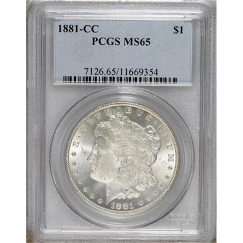 <B>1881-CC $1 MS65 PCGS.</B></I> The design elements are well executed throughout, with no troublesome weakness evident above Liberty's ear or on the eagle's breast feathers. Intense mint frost produces a beautifully effulgent sheen across the snow-white surfaces. A few minor marks and luster grazes are too insignificant to prevent the Gem grade assessment. <BR><BR><b>Shipping:</b> Coins & Currency (<a target="_blank" href="http://www.heritageauctions.com/common/shipping.php">view shipping information</a>)