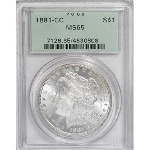 <B>1881-CC $1 MS65 PCGS.</B></I> Pronounced "flash" stands out on this popular, low mintage Gem Carson City dollar. Untoned surfaces exhibit partially prooflike fields and well struck design elements, including nice definition in the hair at Liberty's ear and on the eagle's breast feathers. A couple of small toning spots are noted on the reverse, and a few minor marks scattered about do not detract. Housed in a green-label holder.<BR><BR><b>Shipping:</b> Coins & Currency (<a target="_blank" href="http://www.heritageauctions.com/common/shipping.php">view shipping information</a>)
