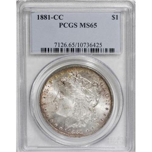 <B>1881-CC $1 MS65 PCGS.</B></I> A frosty and strongly lustrous Gem example of this popular Carson City issue. Streaks of peach and violet patina grace the obverse margins, while the reverse has only a hint of such color on the rims.<BR><BR><b>Shipping:</b> Coins & Currency (<a target="_blank" href="http://www.heritageauctions.com/common/shipping.php">view shipping information</a>)