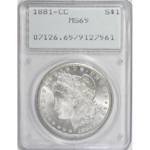 <B>1881-CC $1 MS65 PCGS.</B></I> Bright and brilliant, with intense mint frost and snow-white surfaces. Boldly struck with a few minor, scattered marks on each side. A dazzling Gem, housed in a first-generation PCGS holder. <BR><BR><b>Shipping:</b> Coins & Currency (<a target="_blank" href="http://www.heritageauctions.com/common/shipping.php">view shipping information</a>)