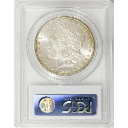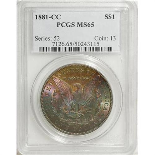<B>1881-CC $1 MS65 PCGS.</B></I> A vibrant example of this popular issue, made widely available through the GSA sales. This Gem is mounted reverse-up in the holder, the better to display that side's delightful patchwork lemon-gold, orange, lavender, pink, cerulean, lime-green, and plum patina. The satiny and well struck obverse is largely silver-gray with a touch of carrot toning at the centers.<BR><BR><B>Coin Engraver:</B> George T. Morgan<BR><BR><b>Shipping:</b> Coins & Currency (<a target="_blank" href="http://www.heritageauctions.com/common/shipping.php">view shipping information</a>\)