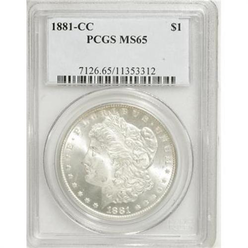 <B>1881-CC $1 MS65 PCGS.</B></I> The low mintage of the 1881-CC issue (296,000 circulation strikes) and the popular Carson City mintmark contribute to its desirability among collectors. The current Gem displays pleasing luster and a well executed strike. A few minor luster grazes on the silver-gray surfaces preclude an even higher grade.<BR><BR><B>Coin Engraver:</B> George T. Morgan<BR><BR><b>Shipping:</b> Coins & Currency (<a target="_blank" href="http://www.heritageauctions.com/common/shipping.php">view shipping information</a>)