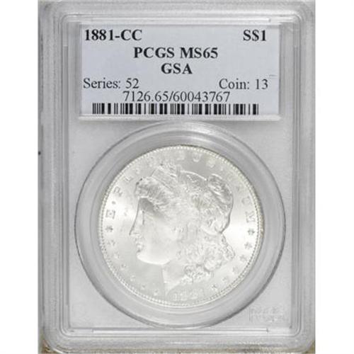 <B>1881-CC $1 MS65 PCGS.</B></I> Ex: GSA. PCGS Population (3772/1507). NGC Census: (1668/677). Mintage: 296,000. Numismedia Wsl. Price for NGC/PCGS coin in MS65: $740. (#7126)<BR><BR><B>Coin Engraver:</B> George T. Morgan<BR><BR><b>Shipping:</b> Coins & Currency (<a target="_blank" href="http://www.heritageauctions.com/common/shipping.php">view shipping information</a>)